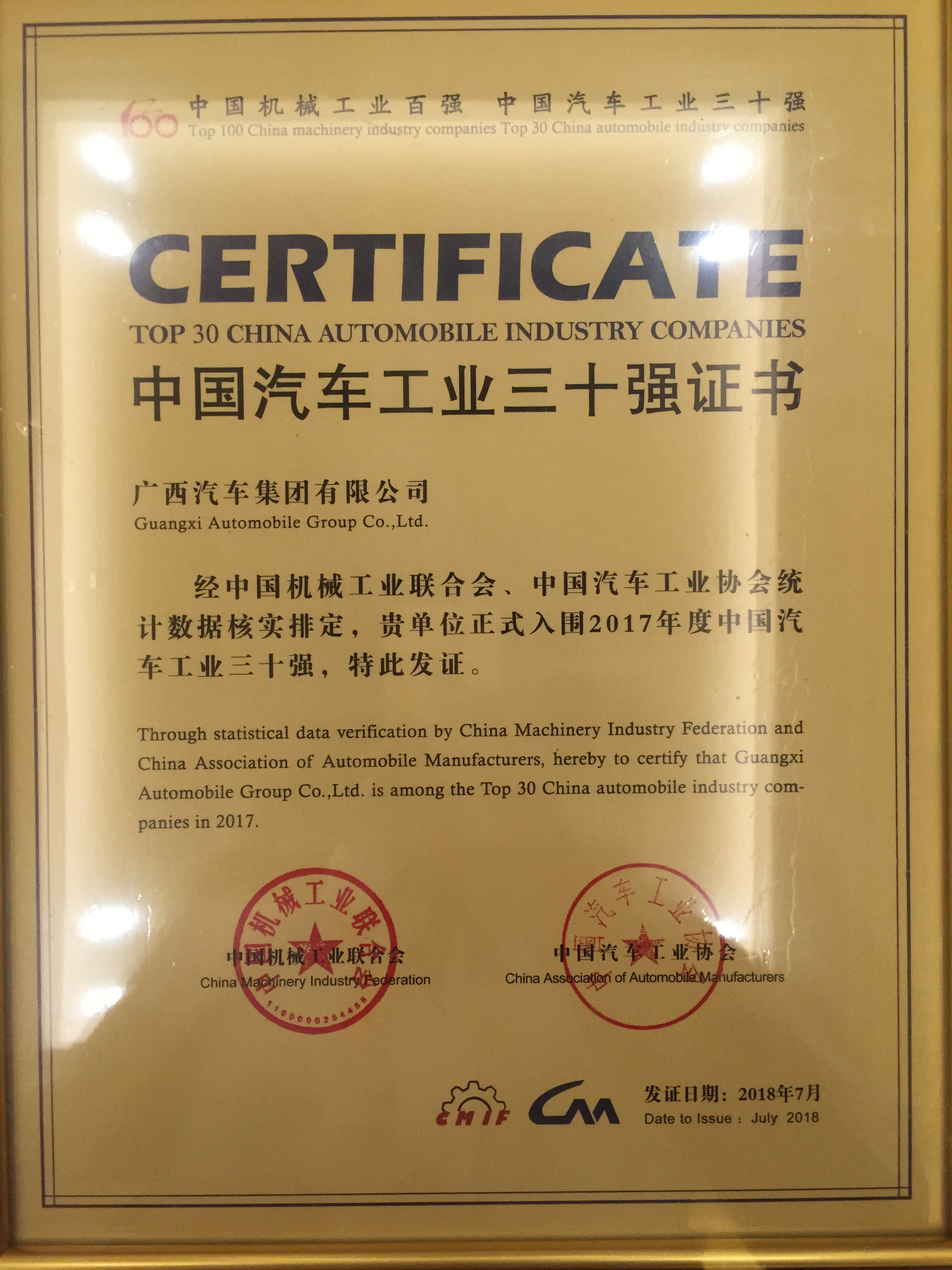 2018年7月13日,由中國機(jī)械工業(yè)聯(lián)合會、中國汽車工業(yè)協(xié)會聯(lián)合組織開展的“2017年中國機(jī)械工業(yè)百強(qiáng)企業(yè)、汽車工業(yè)30強(qiáng)企業(yè)”榜單揭曉并正式向社會發(fā)布,廣西汽車集團(tuán)公司以2017年度營業(yè)收入220億元榮登“2017中國汽車工業(yè)30強(qiáng)企業(yè)”榜單,排名第21位,集團(tuán)已連續(xù)10年躋身“中國汽車工業(yè)30強(qiáng)企業(yè)”行列。
