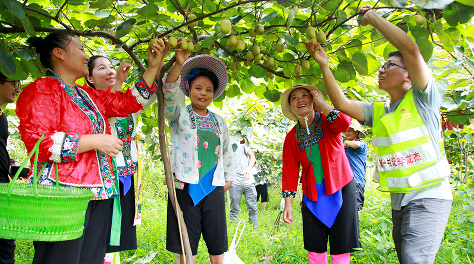 因地制宜,深化推進“公司+合作社+農(nóng)戶+貧困戶”產(chǎn)業(yè)模式,大力推進產(chǎn)業(yè)幫扶,圖為幫陽村400畝紅心獼猴桃基地